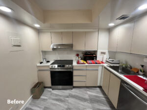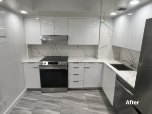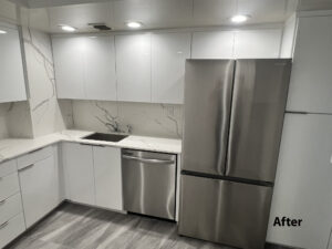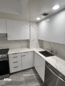 The first step was to replace the old countertop with elegant Calacatta Lazza quartz. This material, known for its durability and easy maintenance, features soft gray veins that contrast beautifully with the predominant white, adding a touch of sophistication and elegance to the kitchen. The final result was a renovated kitchen, more spacious and with a contemporary style that combines functionality and aesthetics, exceeding the client’s expectations.