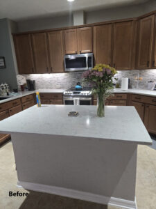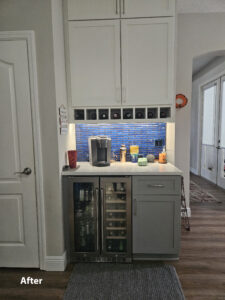 refacing the lower cabinets. They went with a mission door style from our Kitchen Solvers Classic Collection line in a pewter color for the lower cabinets, while the uppers were done in white. Next, we added a new Gris Quantum quartz countertop and a stunning Regala Token backsplash. To finish this transformation, we converted an old desk area into a coffee/drink station. Now our homeowners finally have the kitchen of their dreams!