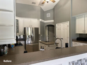 Kitchen remodel project where the homeowners wanted to update their kitchen to a more modern look while also changing the layout. The remodel started by tearing out the old cabinets and removing some walls to open up the kitchen.