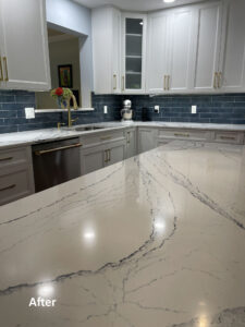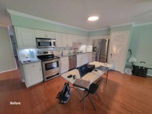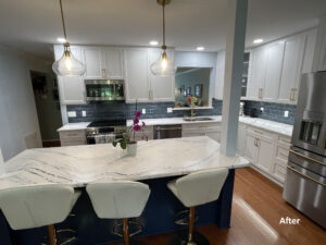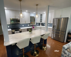 This kitchen remodel involved a significant transformation to enhance both function and aesthetics. The existing soffits and pantry were removed to create a more open and spacious layout. A new island was added as a central feature of the kitchen.