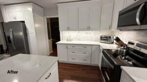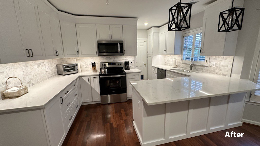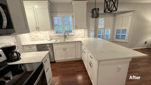 For this kitchen remodeling project, we collaborated with a customer who envisioned a new and more functional kitchen. The client’s wish list included a brighter space, taller cabinets, the removal of the soffit, a fresh backsplash, and additional countertop space. Recognizing the concern about the kitchen’s darkness, we strategically approached the design to maximize natural and artificial lighting; we used task lights under the cabinets, relocated the can lights in the ceiling and used polar white cabinets.
