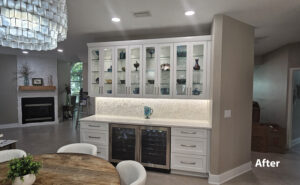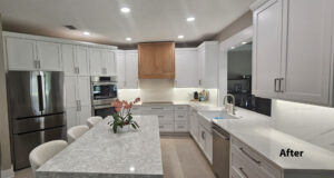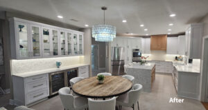 showcase the design we came up with, which they loved. On one side of the kitchen, we created a long bar area with dual wine coolers that serves as the bar and another serving area. A large pantry cabinet was built between the refrigerator and ovens with an adjustable height rollout system in the lower section. The new cabinets are from our Kitchen Solvers Legacy Collection in a classic white. The hood was custom designed to be the focal point of the kitchen and the honey maple wood matches what we did with the island cabinets. For the counters, we did the island with a waterfall edge in a Sandgate quartz, while the perimeter counters were done in a Lakedale quartz. We also did a full height backsplash in the same Lakedale quartz. Just look at this amazing kitchen transformation!