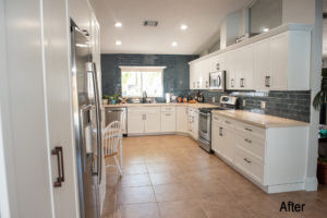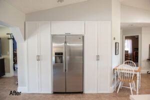 The team also opened the wall next to the refrigerator to make a pantry with matching cabinet doors for additional storage. Using Northern Contours Shaker Doors in Stratus White SuperMatte, the kitchen went from glossy and outdated to sleek and traditional. A Capri Quartz Silestone countertop with blue subway tiles for backsplash was added to complete the look. Crown molding was added to the top of the cabinets and light molding was added below to give the full kitchen the squared edges that are usually evident in a more European style. This white kitchen got a full makeover, without a full overhaul and demolition. The team was in and out in days and the homeowners now have a space they are excited to walk into every day.